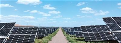 大漠东南缘,占地1.32万亩、总装机容量55万千瓦的国家电投五凌电力余丁光伏电站沐浴在阳光下。驱车驶入,只见数以万计的光伏板纵横密布,连成一片蓝色汪洋;光伏板下,绿草茵茵,如繁星点缀。
